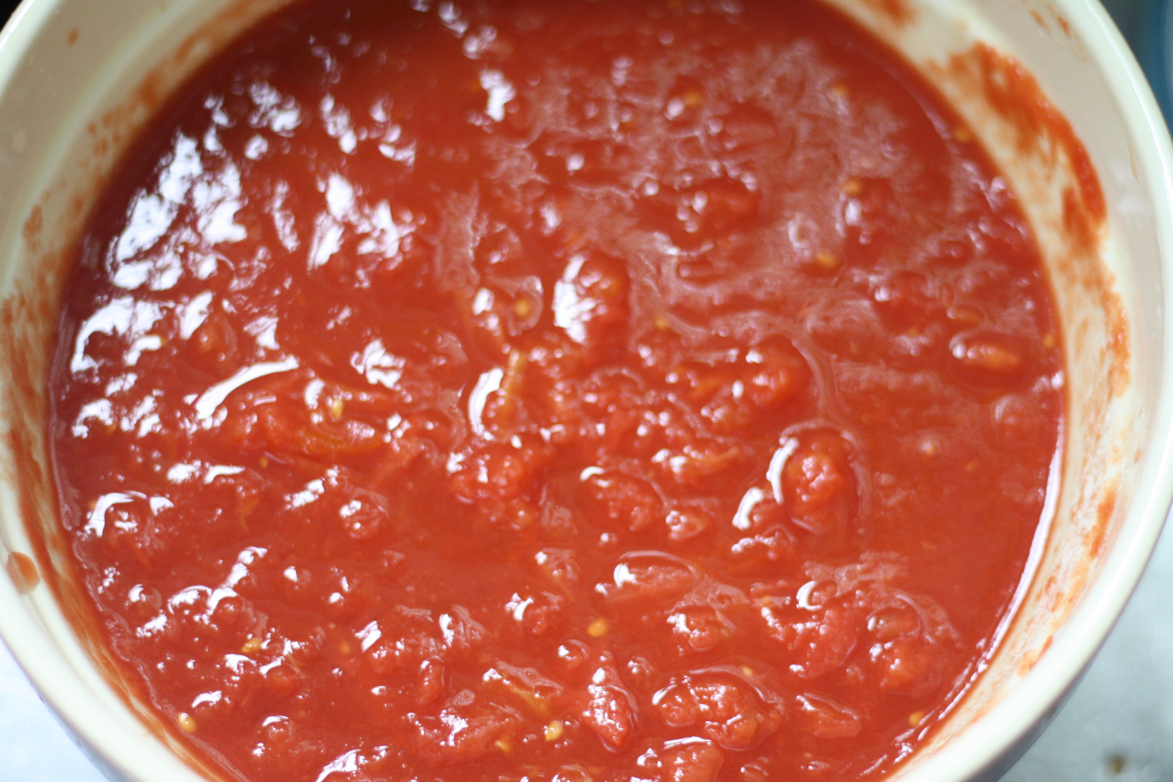 In a large bowl, crush the tomatoes with your clean hands until they are in bite-size pieces. (This is surprisingly enjoyable and recommended as a job for kids... I generally don't trust the cleanliness of my kids' hands, so we would be doing a good, long scrubbing before I let them put their hands in food I'm preparing).