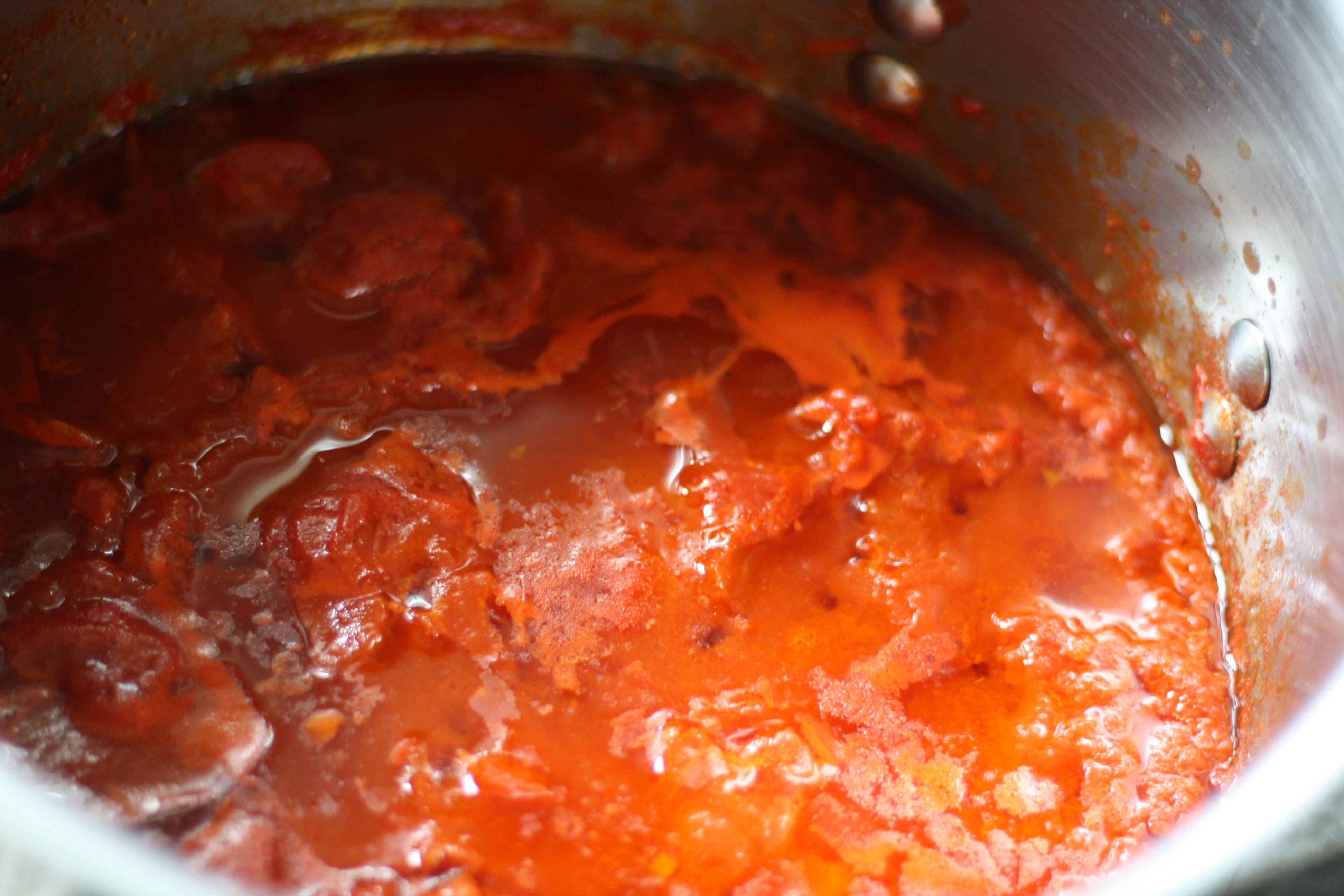 In a large saucepan over medium-high heat, warm the olive oil, add the garlic, and cook, stirring, until it begins to sizzle, about 1 minute. Add the tomatoes and 1 tsp salt and bring to a boil. Lower the heat and let the sauce simmer, stirring every so often, until it is slightly reduced, about 30 minutes.