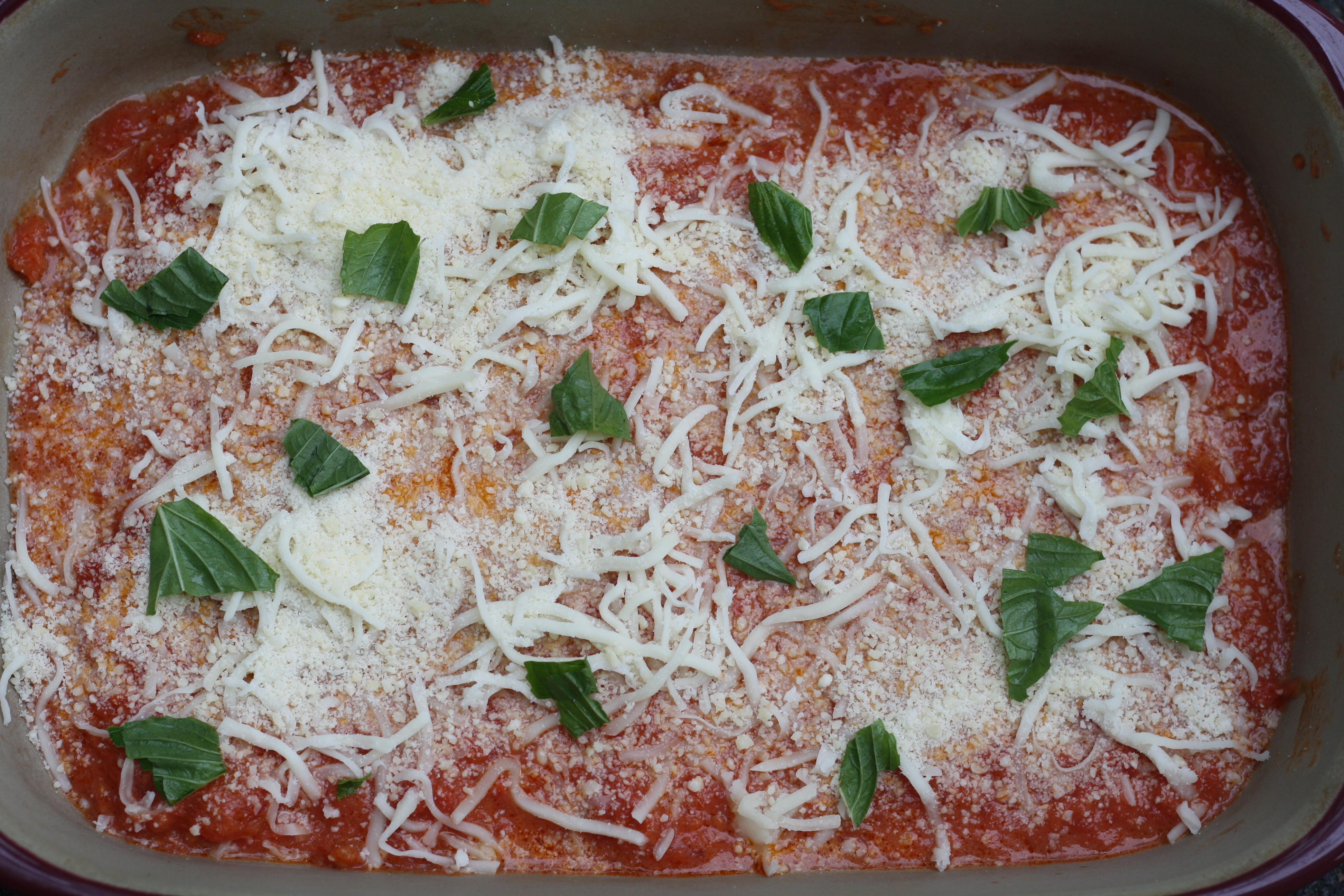 Ladle a thin layer of room-temperature sauce onto the bottom of a 9-by-13-in baking dish. Spread the sauce with a spoon to cover the surface of the dish. Add a layer of 3 sheets of pasta. Spoon over just enough tomato sauce to cover the pasta and then scatter over some of the Parmesan, mozzarella, and basil. Repeat the layering process until you’ve used up all of your components (4 layers of noodles; I do one layer with the lasagna vertically as pictured, the next horizontal, breaking the third piece in half). End with sauce and cheese (not naked pasta or basil, both of which would burn if exposed).